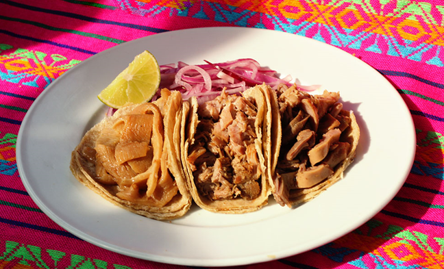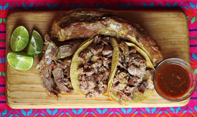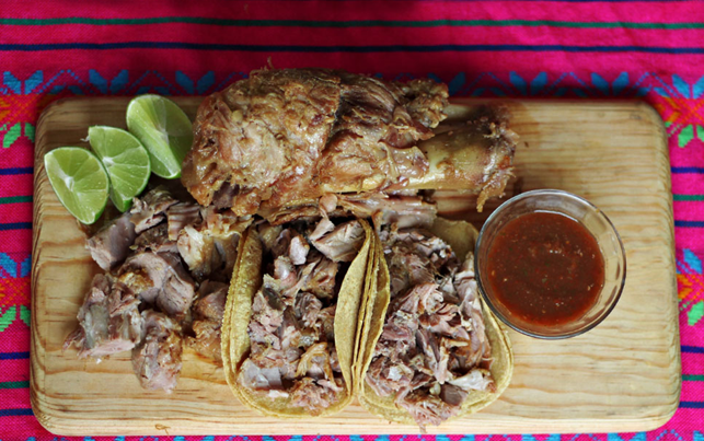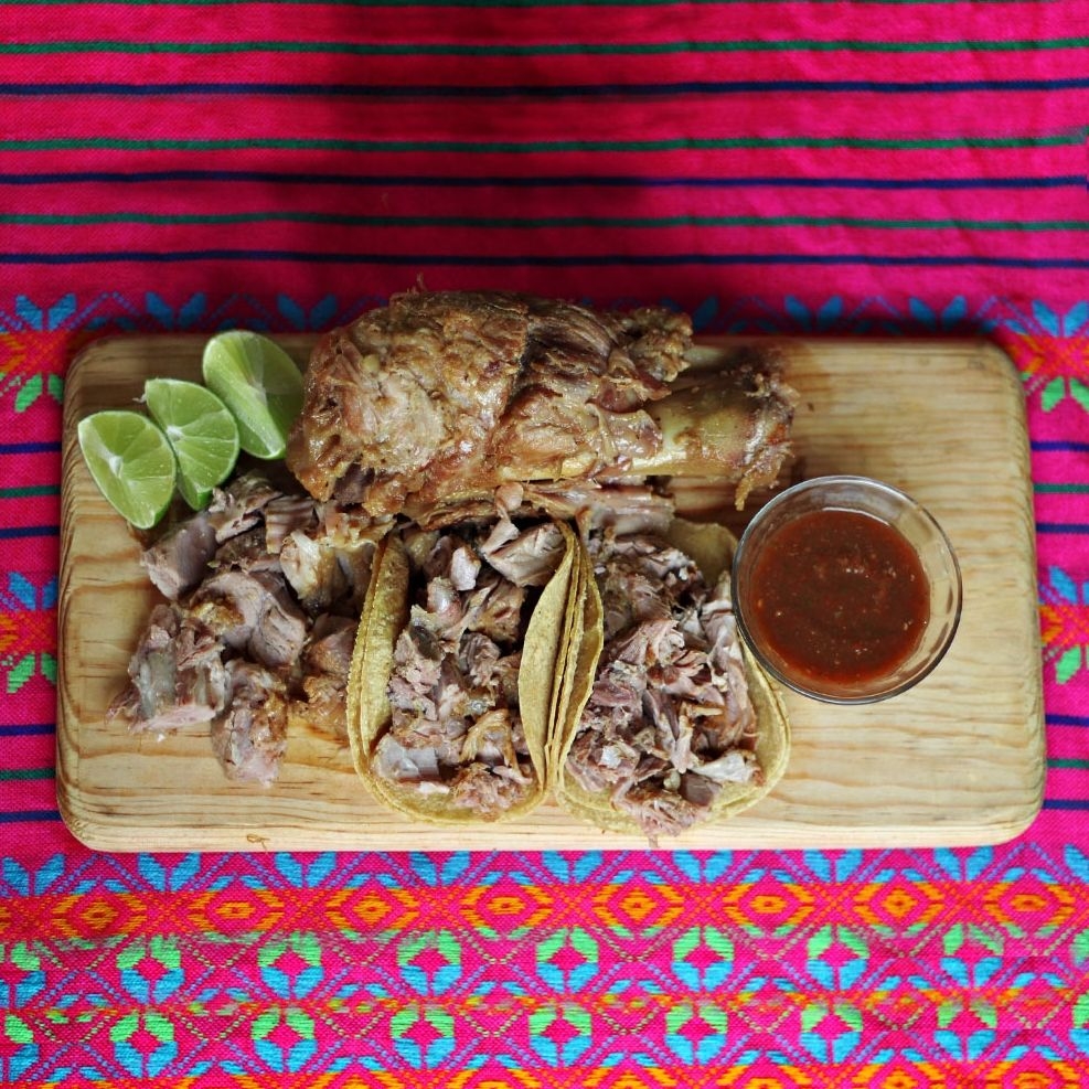 Chamorros en carnitas descarnados. Incluye: salsa verde, cebolla, limones y tortillas.