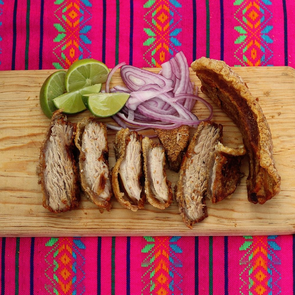 Exquisito chicharrón con doble capa de carne, acompañado de limones, salsa verde, tortillas y cebolla.