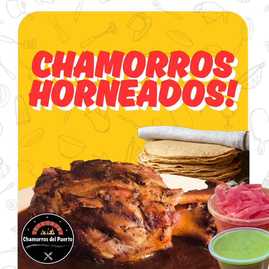 Deliciosos y jugosos Chamorros de cerdo horneados; incluyen, Tortillas, Salsa habanera, Cebolla curtida y caldos del horneado