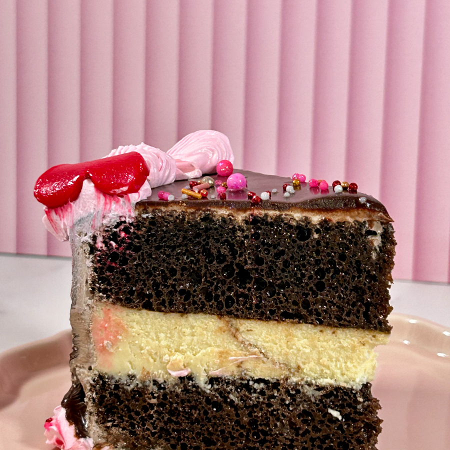 Pan de chocolate húmedo, relleno de cheesecake, untable y cobertura de chocolate. Disponible solo esta temporada de San Valentín