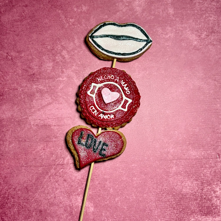 Selección de 3 galletas decoradas de San Valentin en brocheta, perfectas para regalar o endulzar cualquier momento.