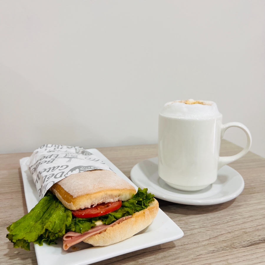 Delicioso combo de un café capuchino 120ml + una chapata de jamón.