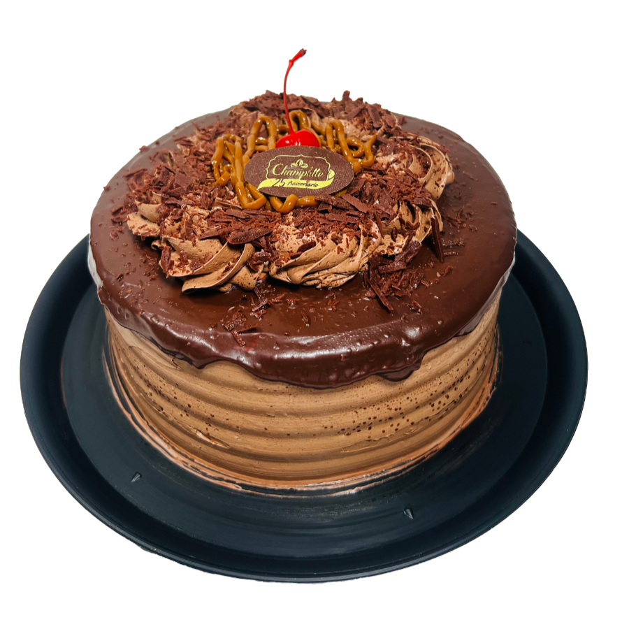 Pan doble chocolate, humectado en nuestro jarabe de chocolate hersheys y relleno de crema de chocolate, cubierto con nuestro betún Carlos V; decorado con un original diseño de ganache, chocolate y cereza.