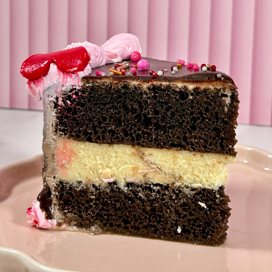 Pan de chocolate húmedo, relleno de cheesecake, untable y cobertura de chocolate. Disponible solo esta temporada de San Valentín