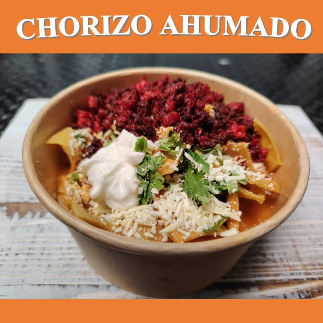 CHILAQUILES CON CHORIZO/SALSA VERDE/ROJA/CREMA/CEBOLLA/CILANTRO