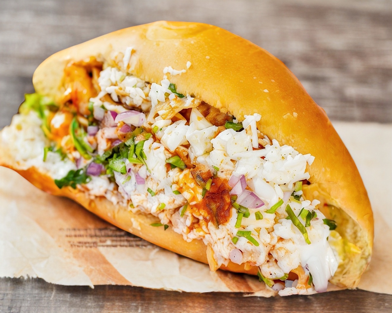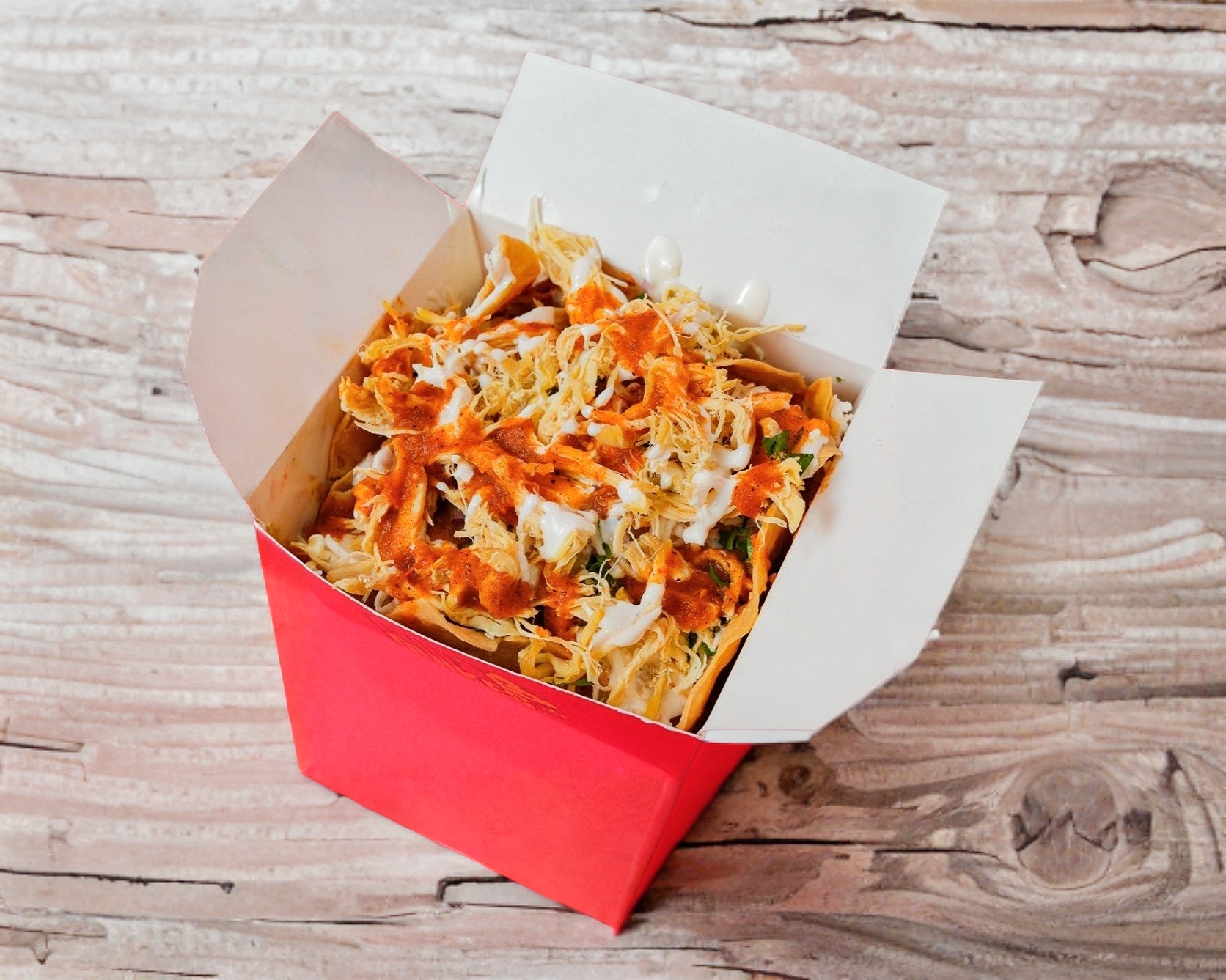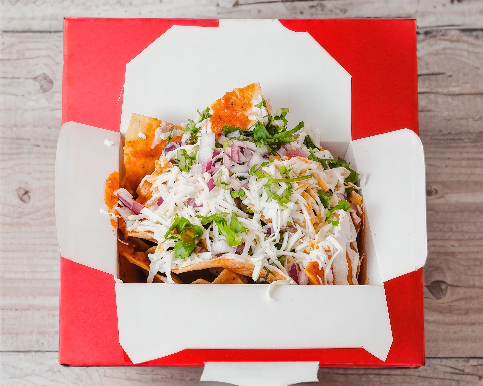 Chilaquiles con salsa roja o verde, crema, queso, cebolla y cilantro.
