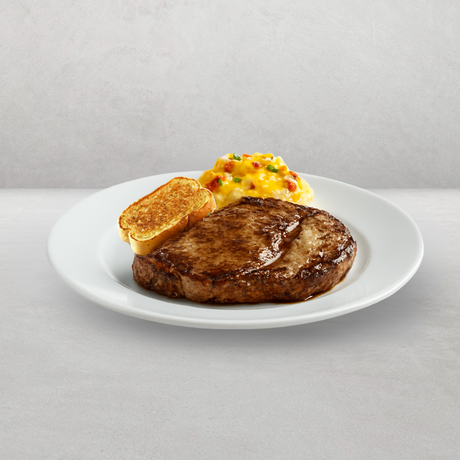 Ribeye (340 gr) sazonado con un toque de mantequilla. Servido con una pieza de pan de ajo y una guarnición a elegir.
