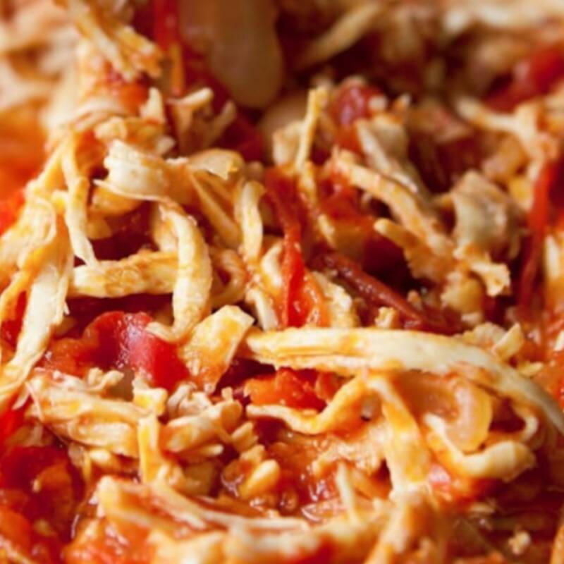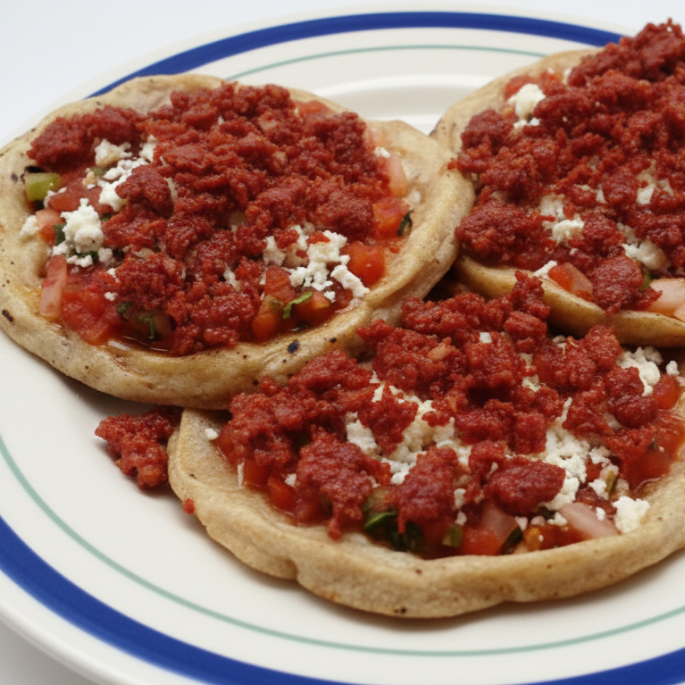 ¡Un clásico potente y sustancioso! Disfruta de nuestra tortilla de maíz doradita con los bordes "pellizcados" para atrapar la salsa, cubierta generosamente con chorizo desmenuzado y crujiente.