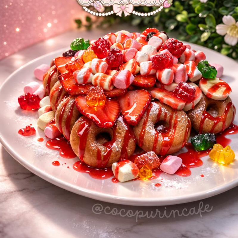 Deliciosas mini donitas, súper esponjositas (14 piezas). Acompañadas de fruta, 2 toppings y 1 Jarabe a elección.