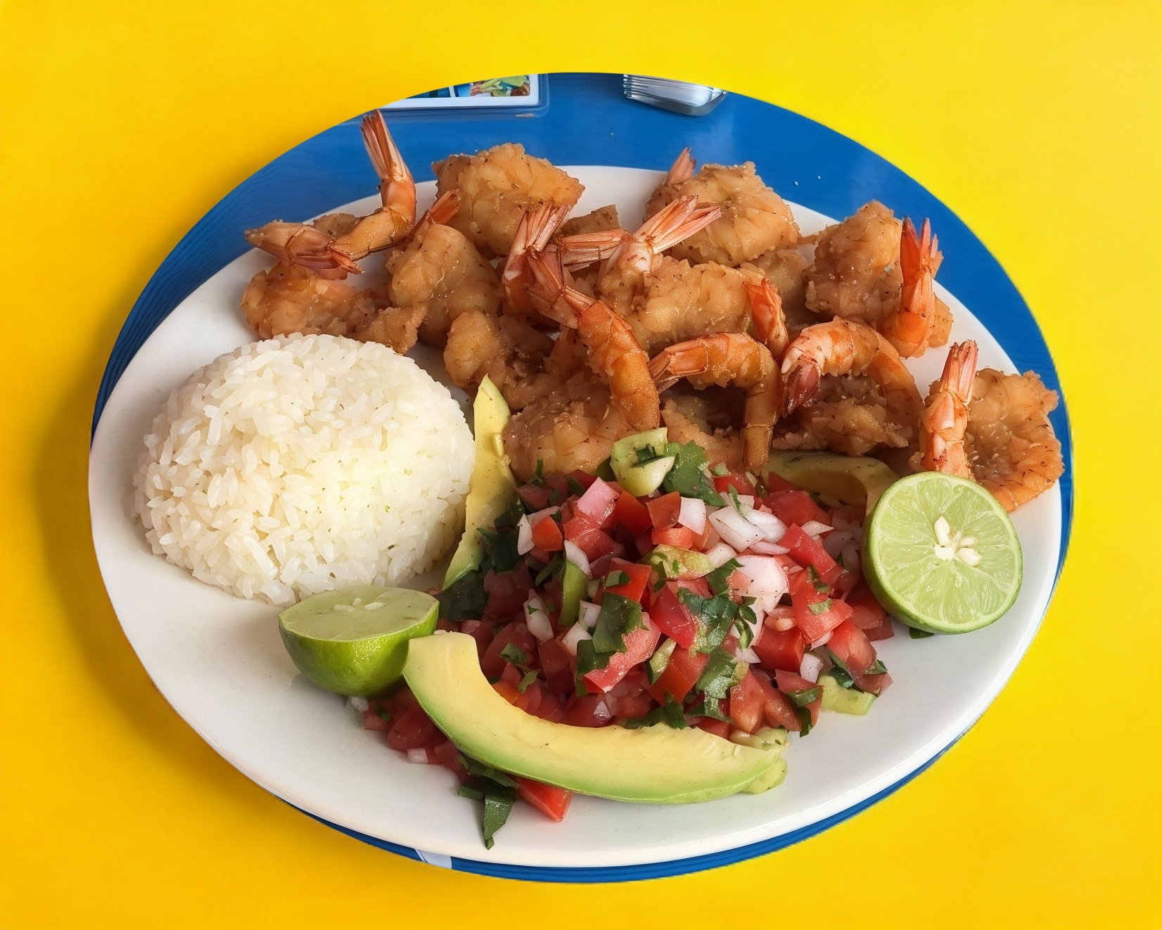 Camarones empanizados, acompañado de ensalada, arroz y pico de gallo y tortillas.