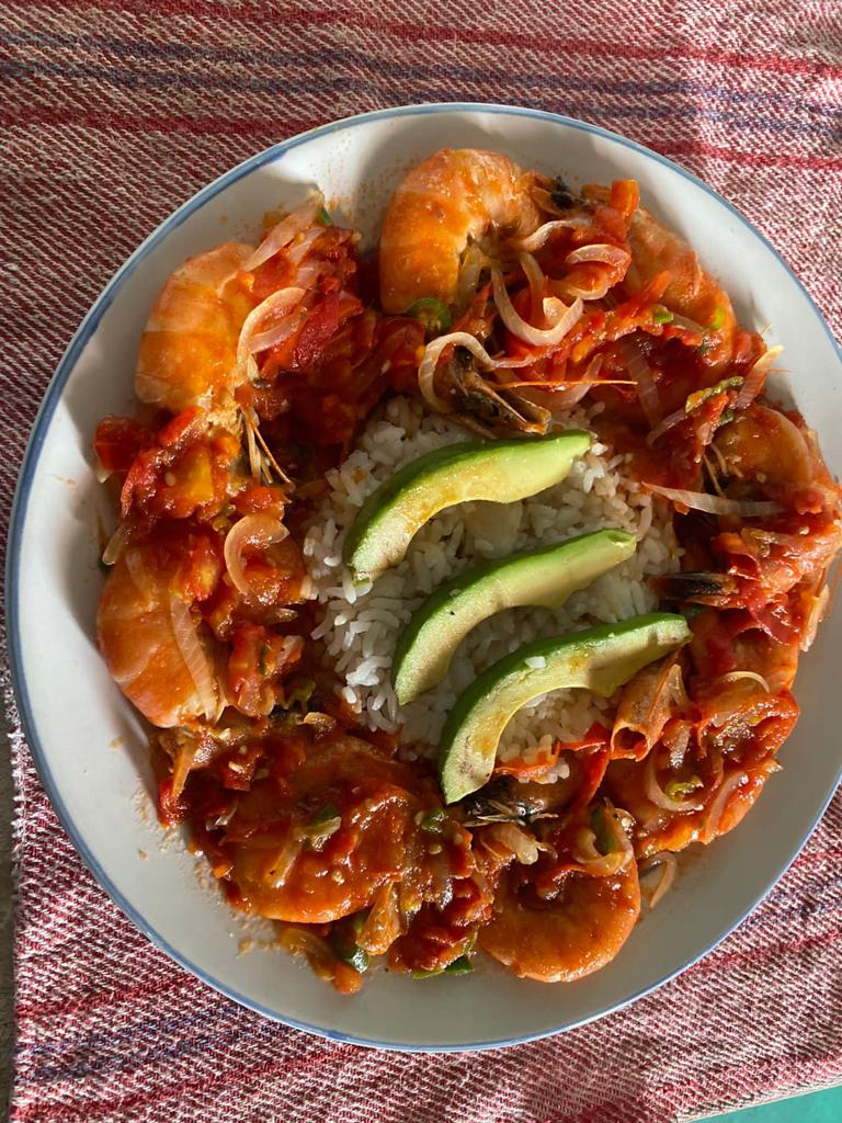 Camarones preparados a la veracruzana acompañado de arroz, aguacate y tortillas