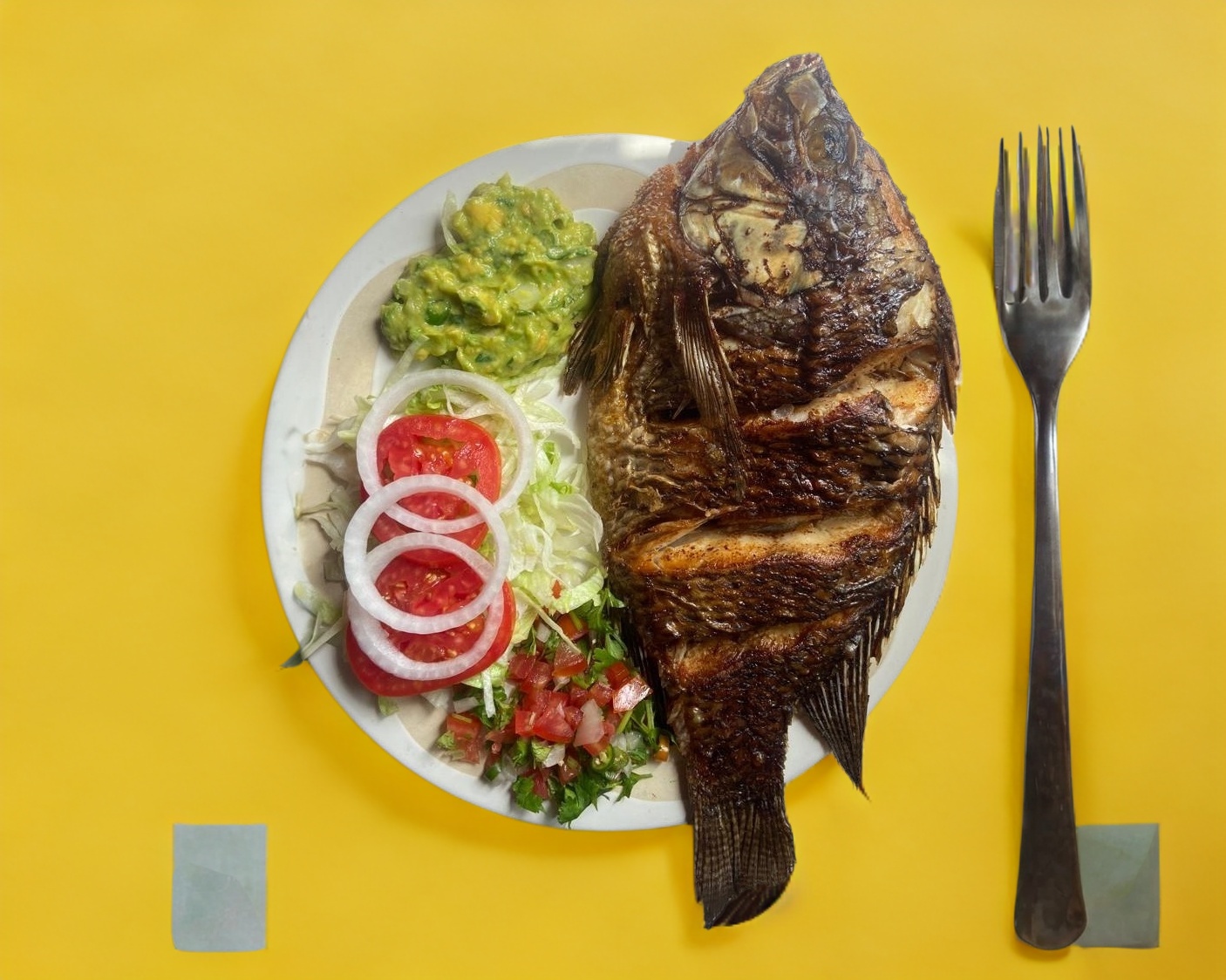 Mojarra frita con rodajas de ajo frita, acompañada de ensalada, pico de gallo, guacamole, y tortillas.