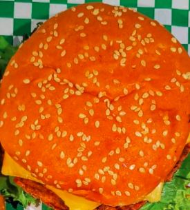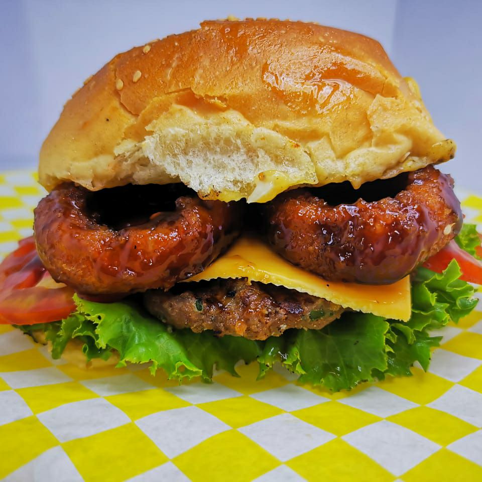 Mayonesa, lechuga italiana, carne, queso americano, aros de cebolla con bbq,capsu,mostaza.