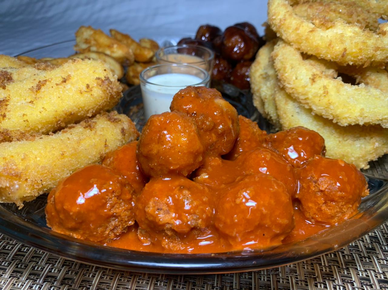 10 boneless (Bufaoo, Bbq,Hony Mustard y spice escoges cuantos quieres de cada salsa), 150 gr de papas gajo, 3 kushiages de queso, 5 pz de aros de cebolla. Cada combox contiene apio, zanahoria, aderezo ranch, aderezo de queso, bufalo,capsu.