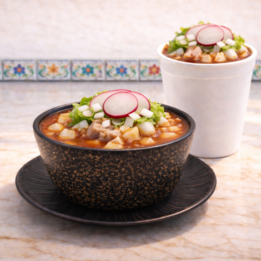 Caldo rojo sazonado con chiles selectos, lleno de granos de maíz cacahuazintle tiernitos y maciza de cerdo (o pollo) deshebrada. lo servimos bien caliente. acompañado de lechuga fresca, rábanos crujientes, cebolla picada y totopos. (16 oz aprox)