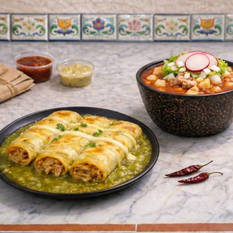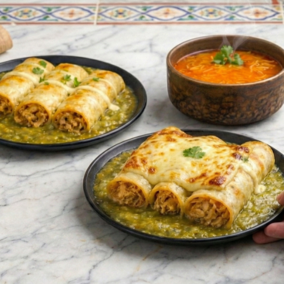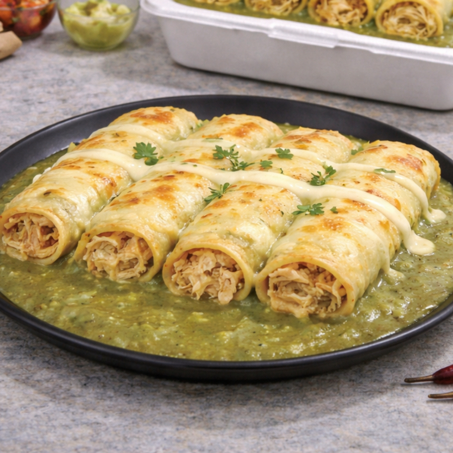 ¡Derretidas de sabor! 🧀 Orden de 3 tortillas rellenas de pollo deshebrado, bañadas en nuestra salsa verde especial (cremosa y suave), cubiertas con una capa generosa de queso manchego gratinado al momento.