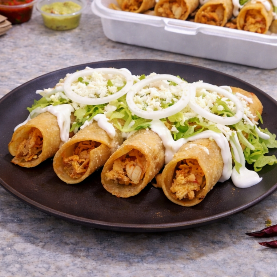 ¡El crunch que esperabas! 🌮 3 tacos de maíz doraditos al momento, rellenos de Pollo. Preparados con: Lechuga fresca picada, crema de rancho y queso espolvoreado.