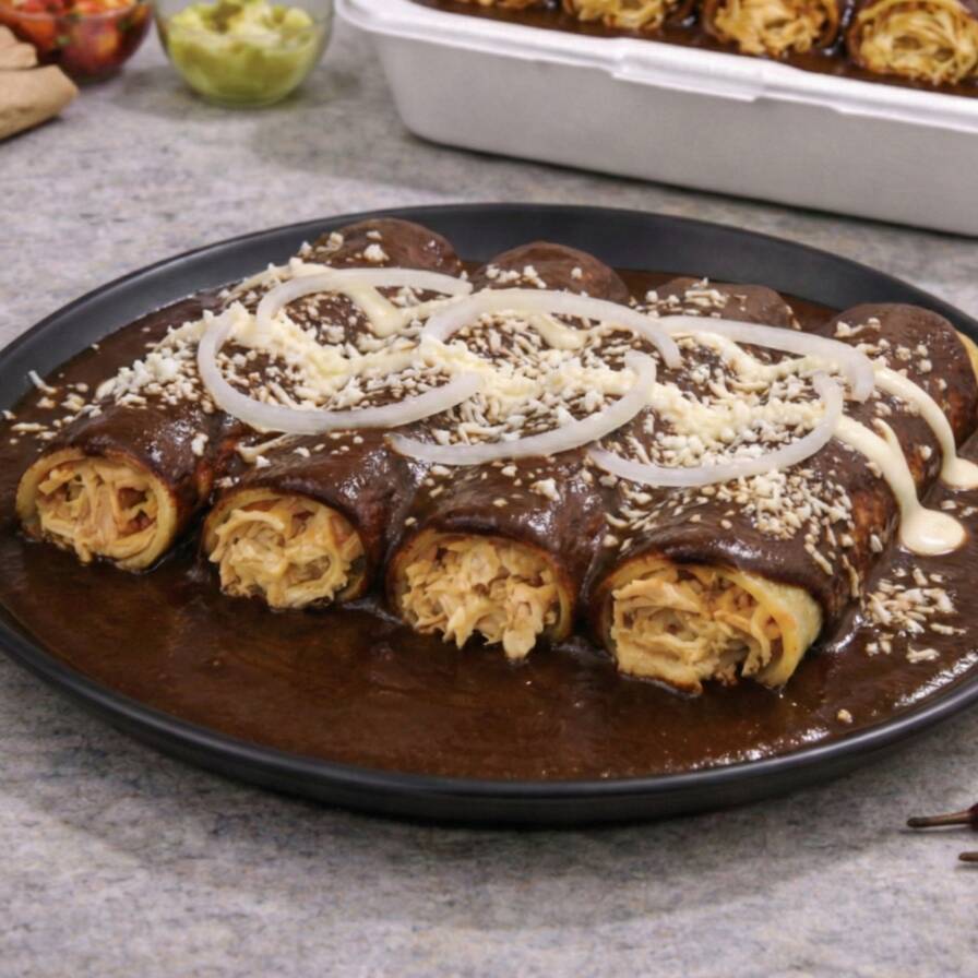 ¡Para los amantes del mole! 3 tortillas de maíz ligeramente doradas, rellenas de pollo deshebrado y bañadas generosamente en nuestro mole especial de la casa (espeso y con el toque dulce-picante exacto).