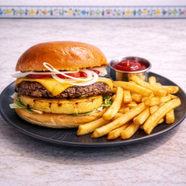 Jugoso medallón de carne preparado, servido entre pan brioche parrillero, tomate, queso manchego, lechuga, cebolla y pepino; servida con piña a la parrilla. (incluye porcion de papas)