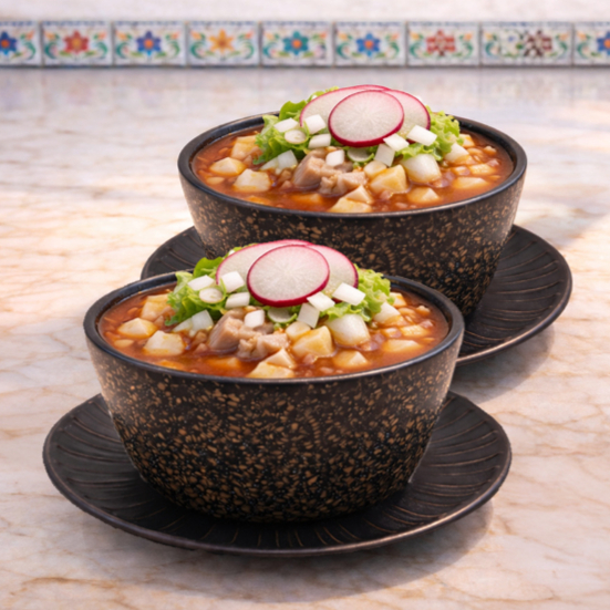 Caldo rojo sazonado con chiles selectos, lleno de granos de maíz cacahuazintle tiernitos y maciza de cerdo (o pollo) deshebrada. lo servimos bien caliente. acompañado de lechuga fresca, rábanos crujientes, cebolla picada y totopos. (32 oz aprox)