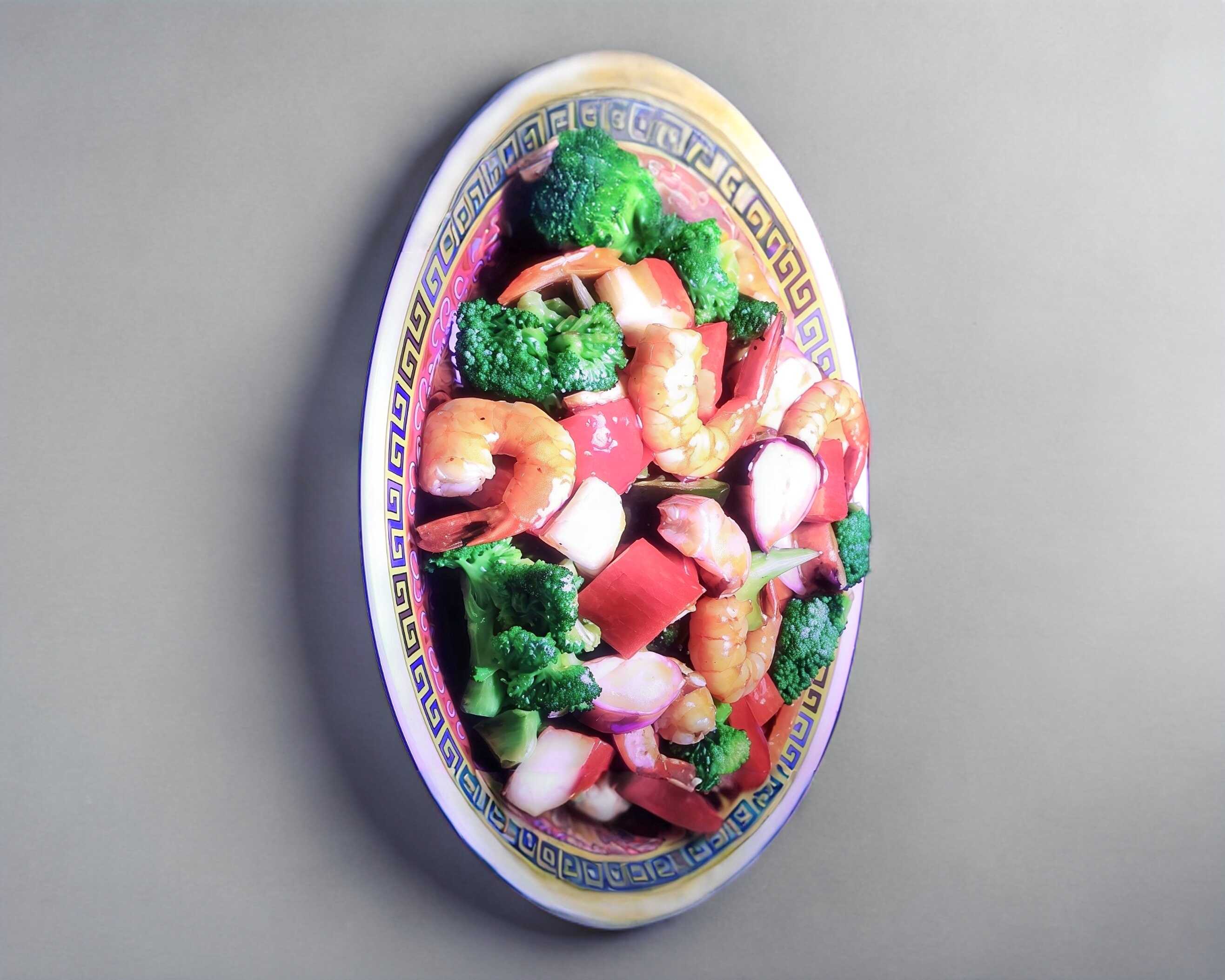 Porción pequeña de mezcla de mariscos y verduras estilo cantones.