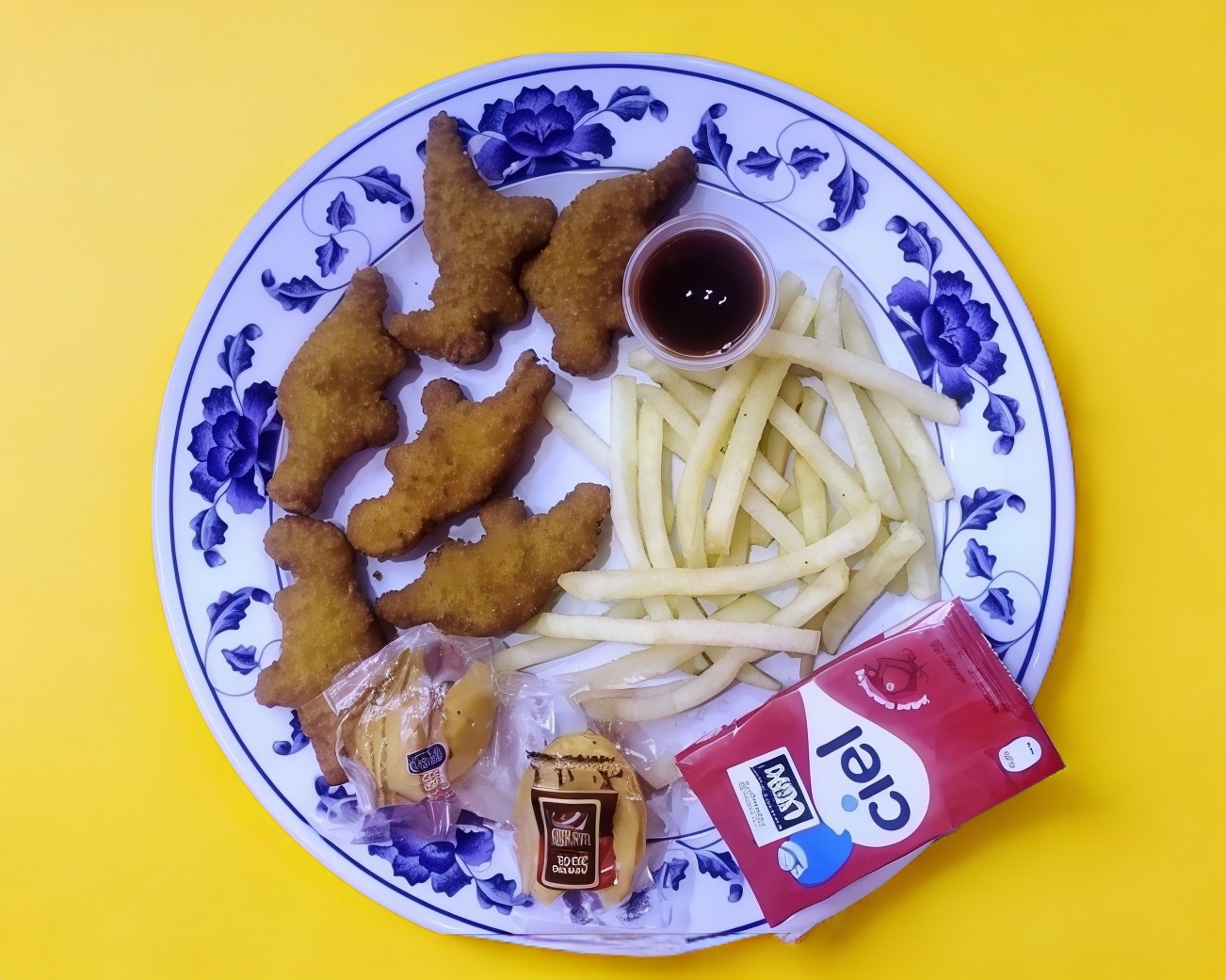 Porción pequeña de pollo empanizado y papas tipo gajo fritas.
