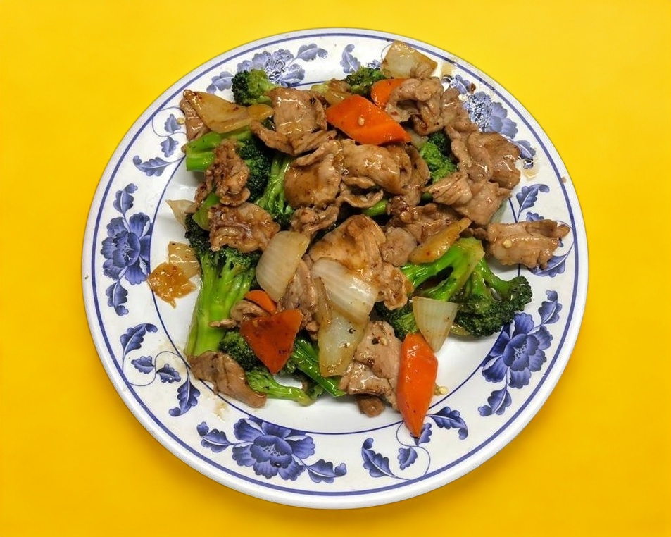 Porción pequeña de carne de res con verduras sazonados con soya.
