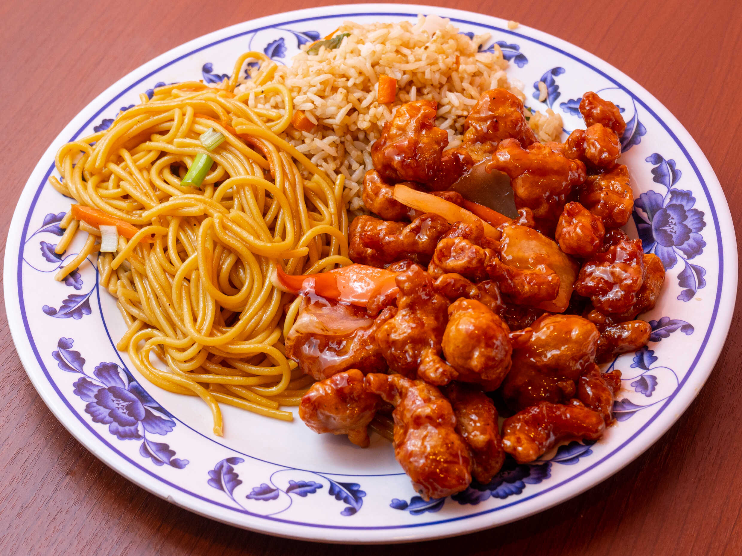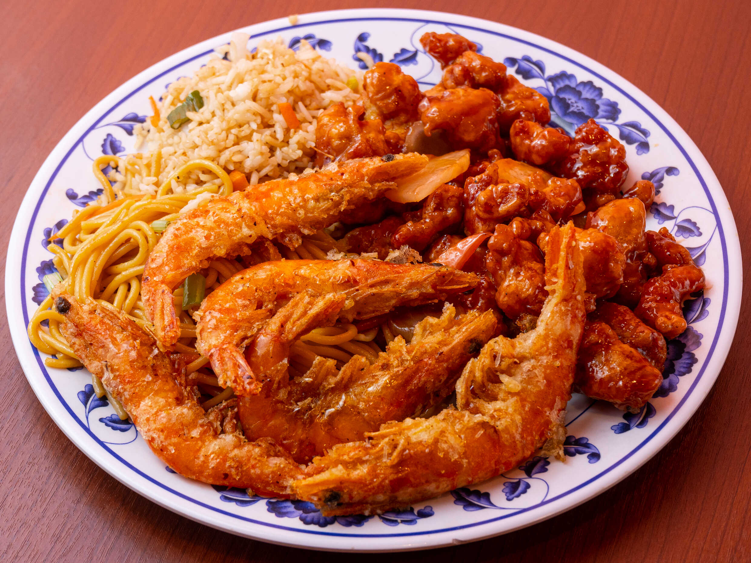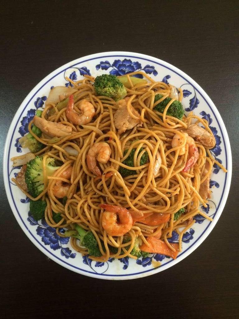 Porción pequeña de espagueti estilo teriyaki, verduras y camarón.
