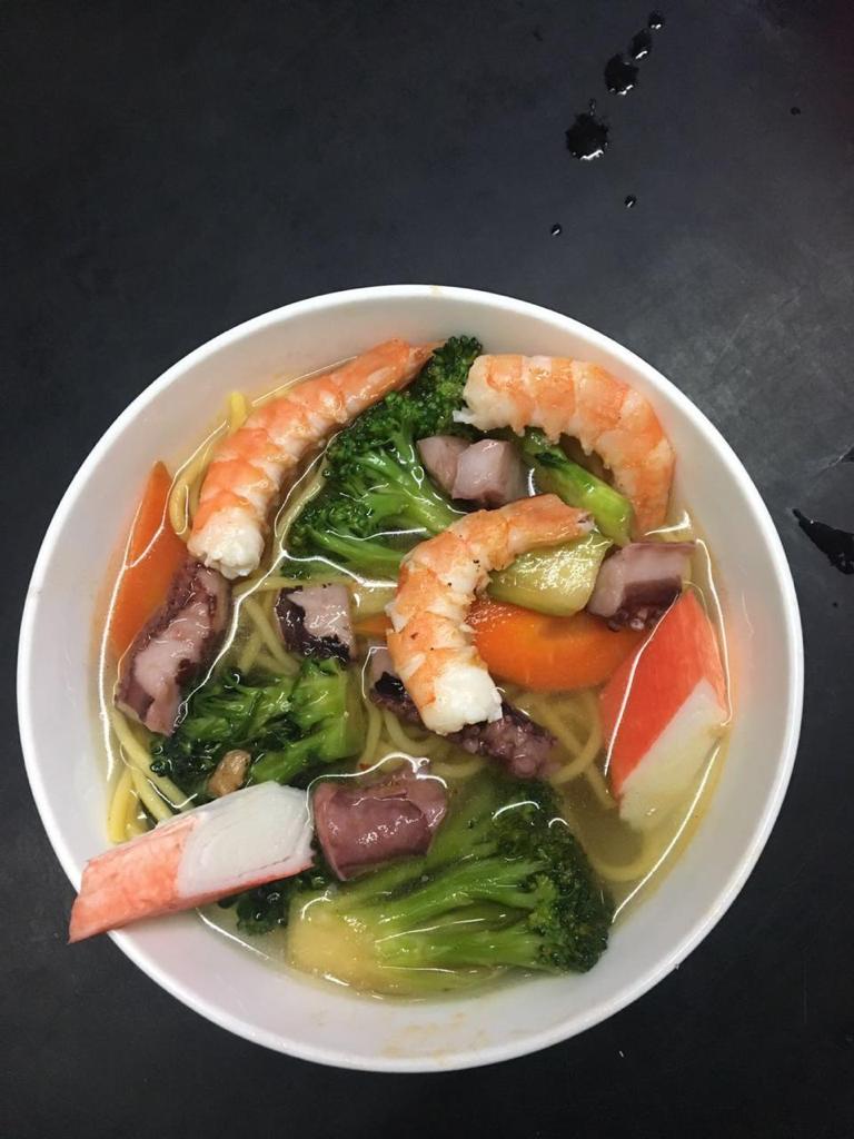 Porción pequeña de mezcla de mariscos y verduras estilo cantones.