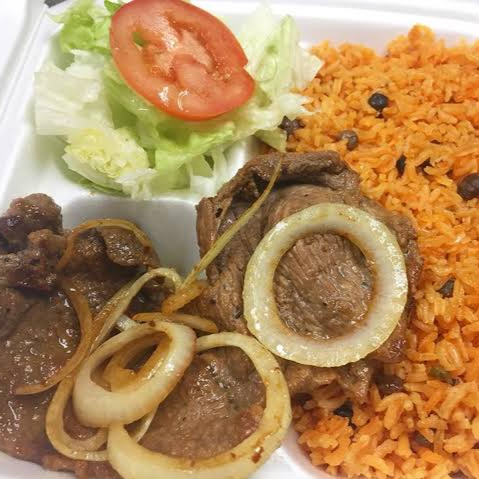 Delicioso bisteck encebollado acompañado de arroz,ensalada y totillas