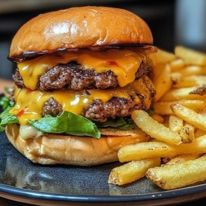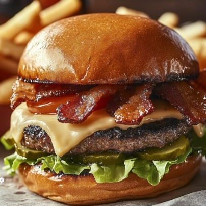 Lechuga, jitomate, cebolla, doble carne con queso americano y gouda, tocino y pan brioche, con papas fritas.