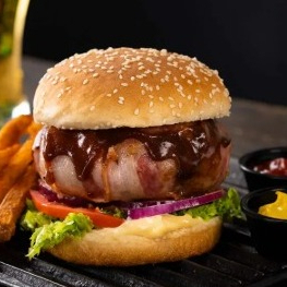 Lechuga, jitomate, cebolla, carne con queso americano, tocino y pan brioche, acompañada de papas fritas.