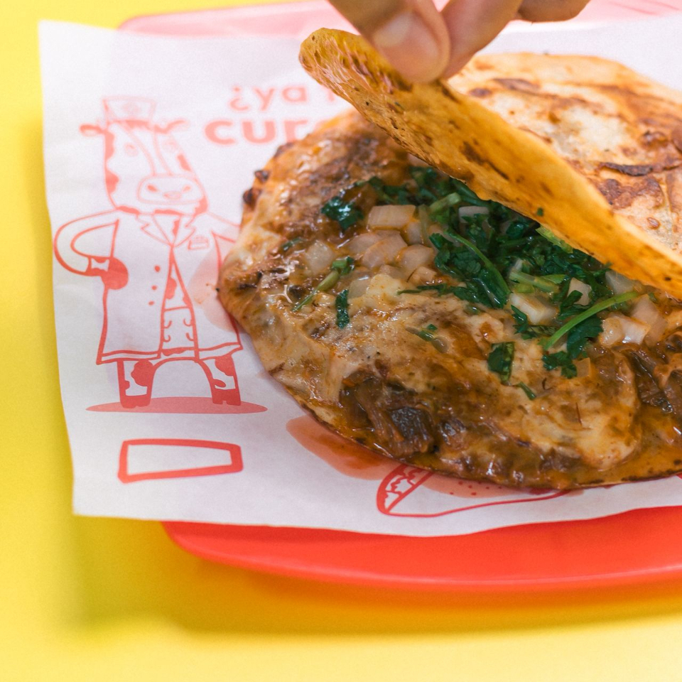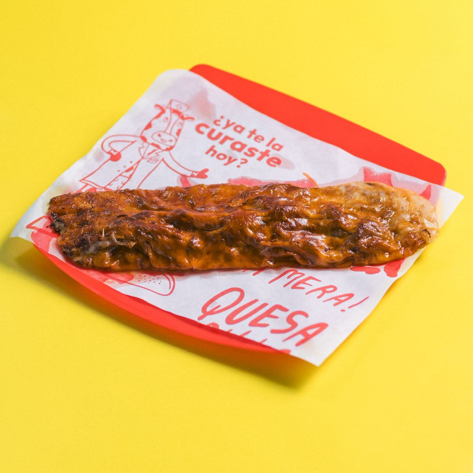 Quesadilla preparada con tortilla de harina, rellena de barbacoa y abundante queso mozzarella fundido.