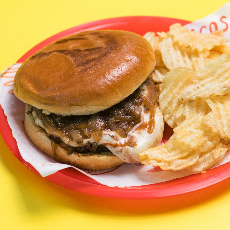 Sándwich en pan brioche suave con barbacoa, cebolla caramelizada, mermelada de frambuesa con chipotle, queso mozzarella fundido, cebolla y cilantro.