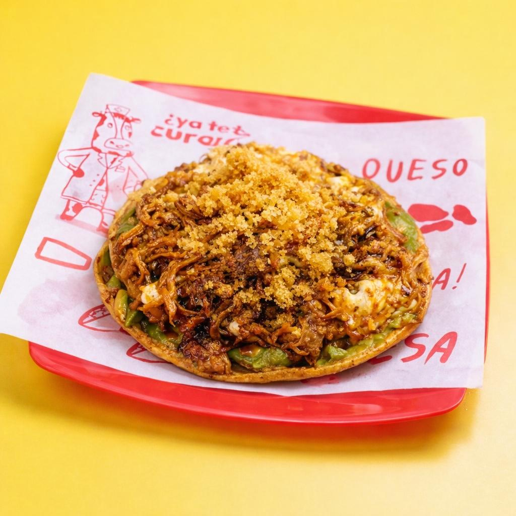 Tostada crujiente con base de guacamole, 50 g de barbacoa, queso mozzarella y boronas de chicharrón prensado.