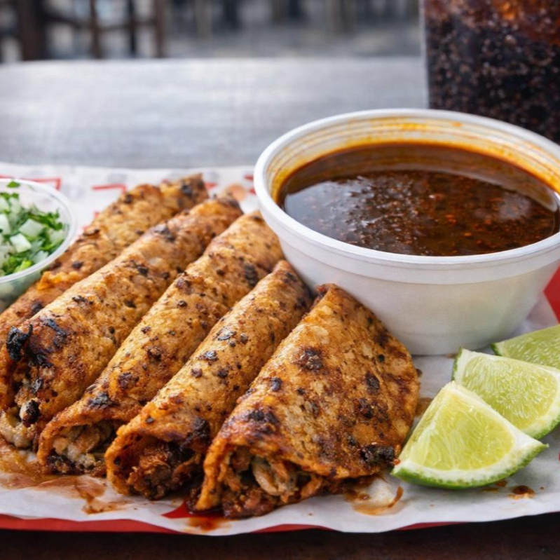 Orden de 5 tacos dorados con queso derretido, acompañados de consomé caliente ideal para chopear.