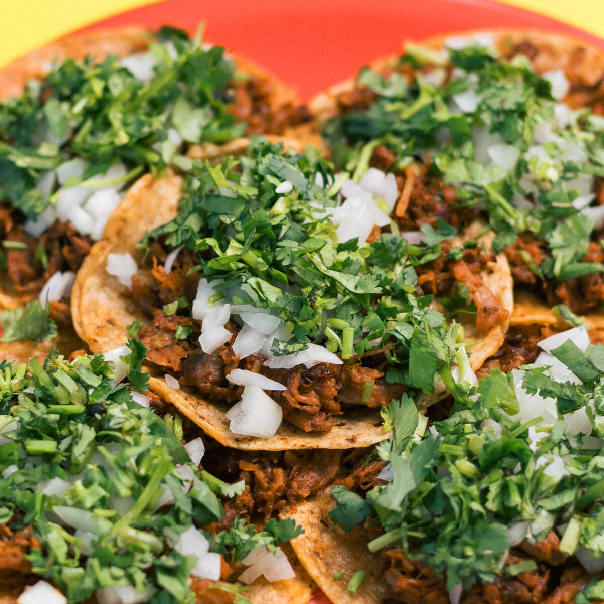 Orden de 5 tacos suaves de barbacoa acompañados con cebolla picada y cilantro fresco.