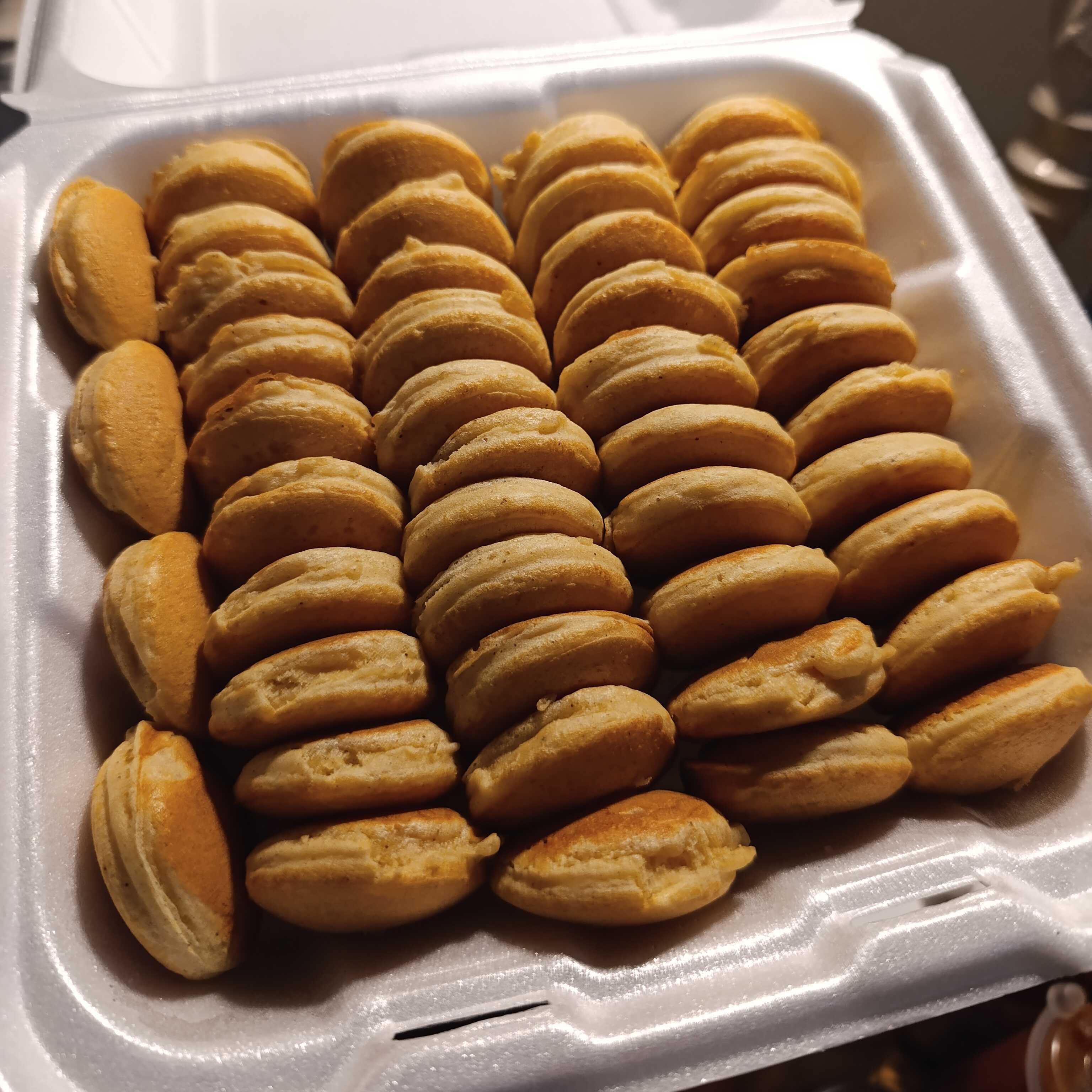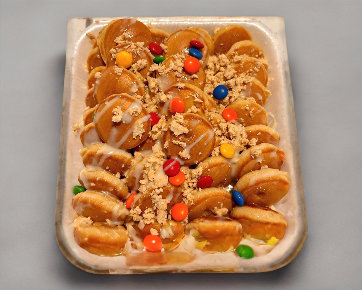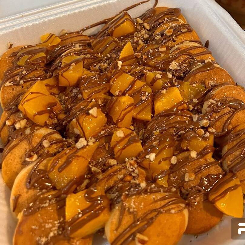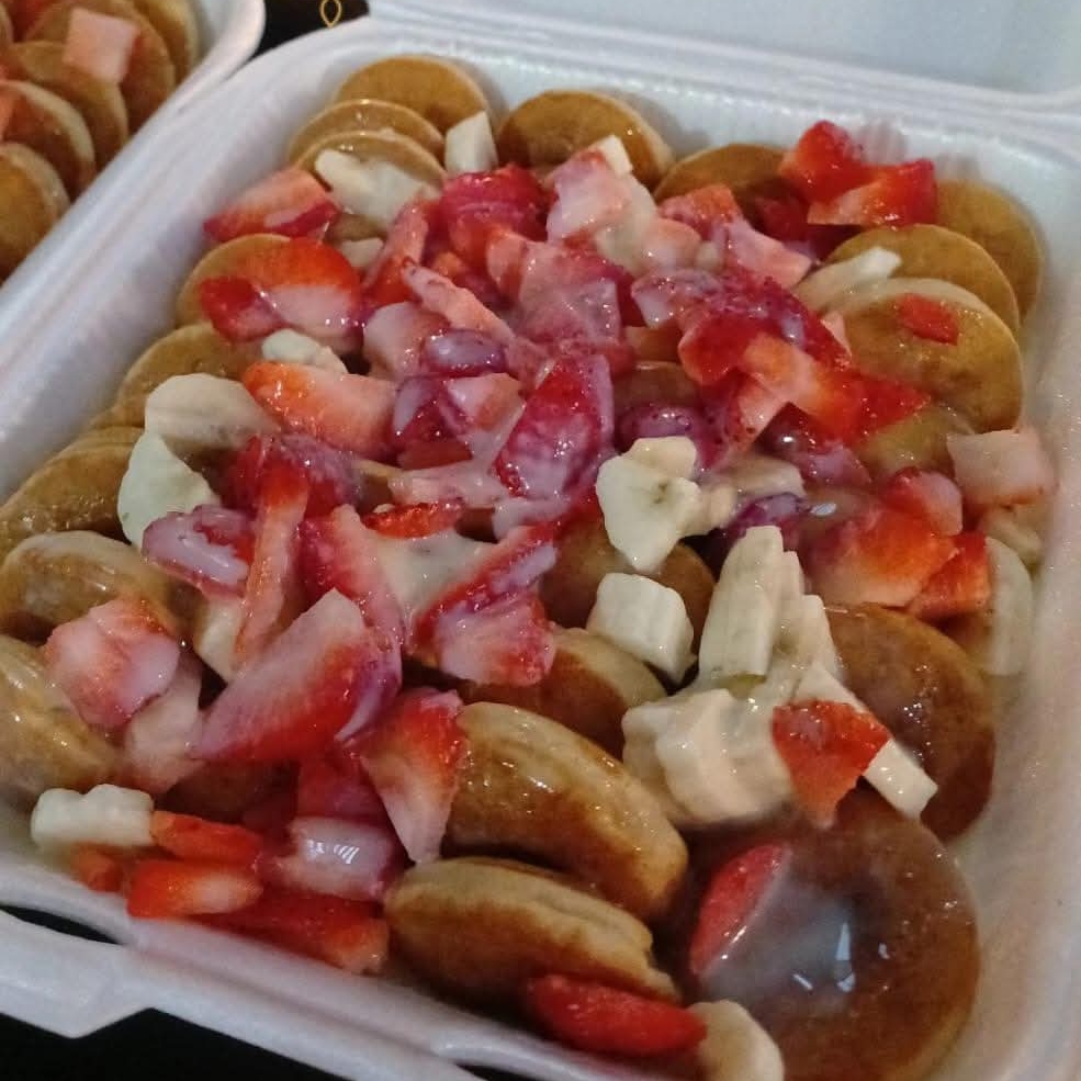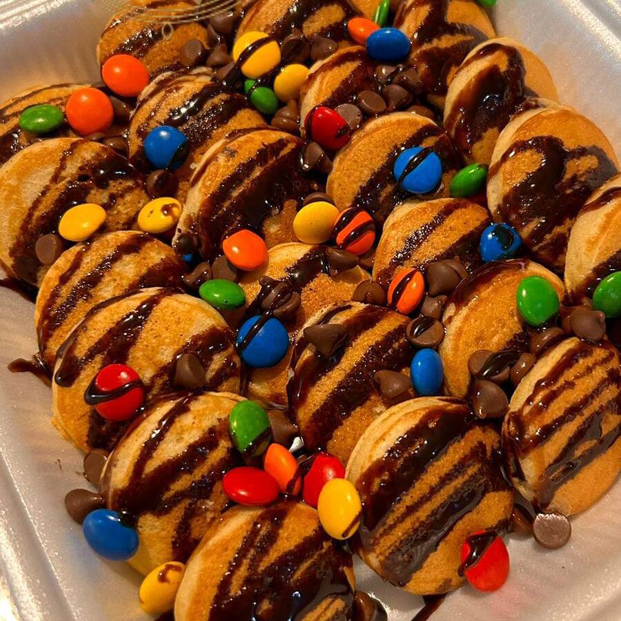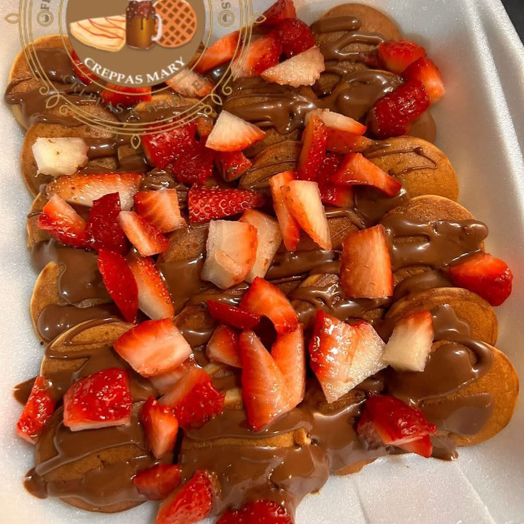 25 piezas de mini Hotcakes, con nutella, trozos de galleta oreo y fresas Naturales