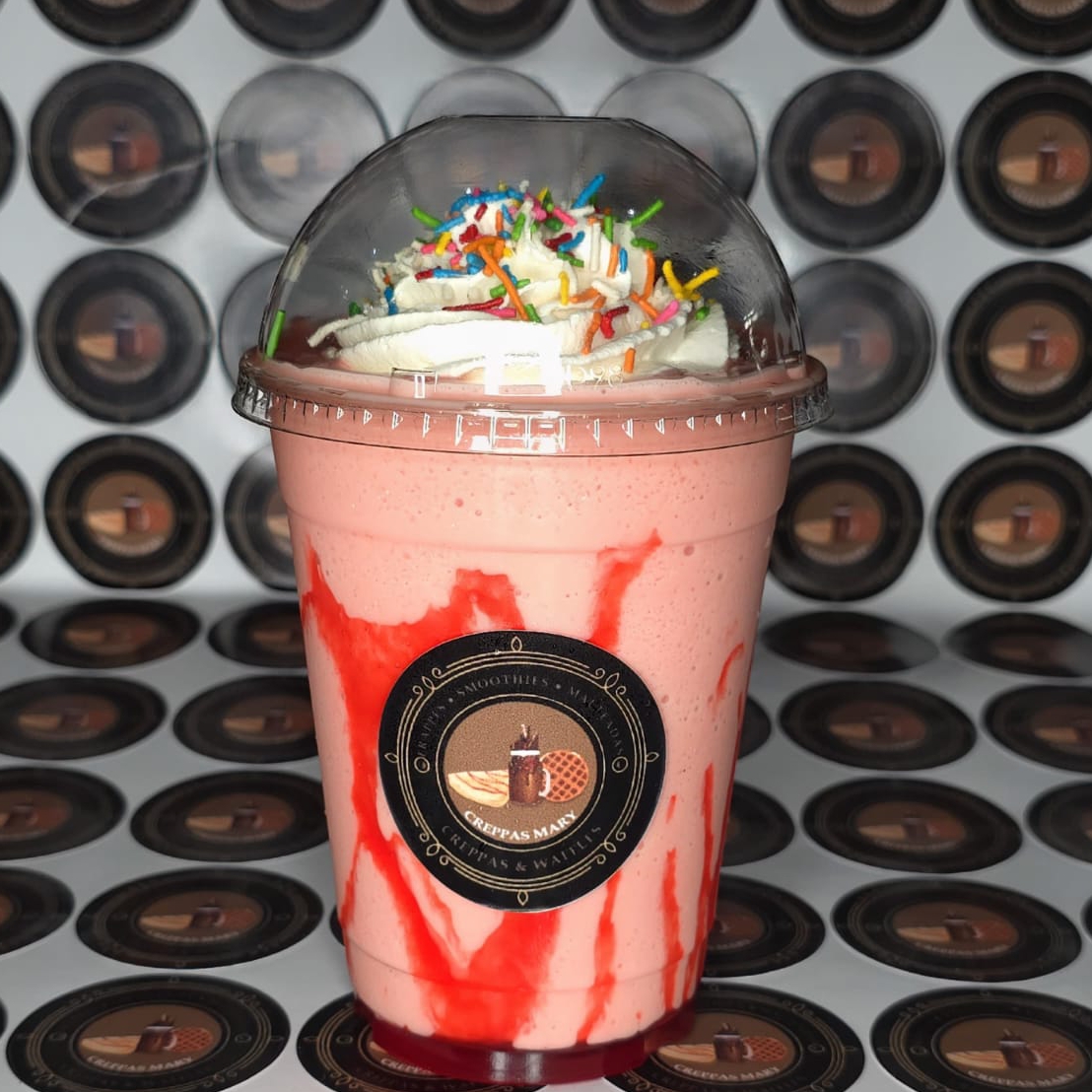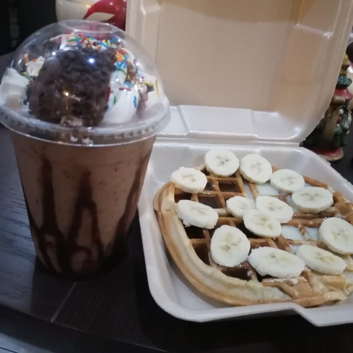 Waffle sencillo mermeladade fresa, frappe de Oreo