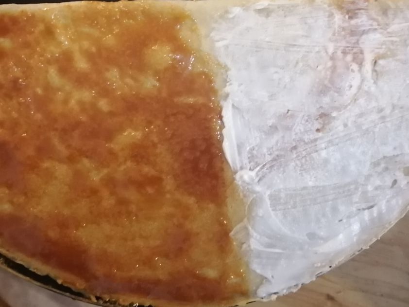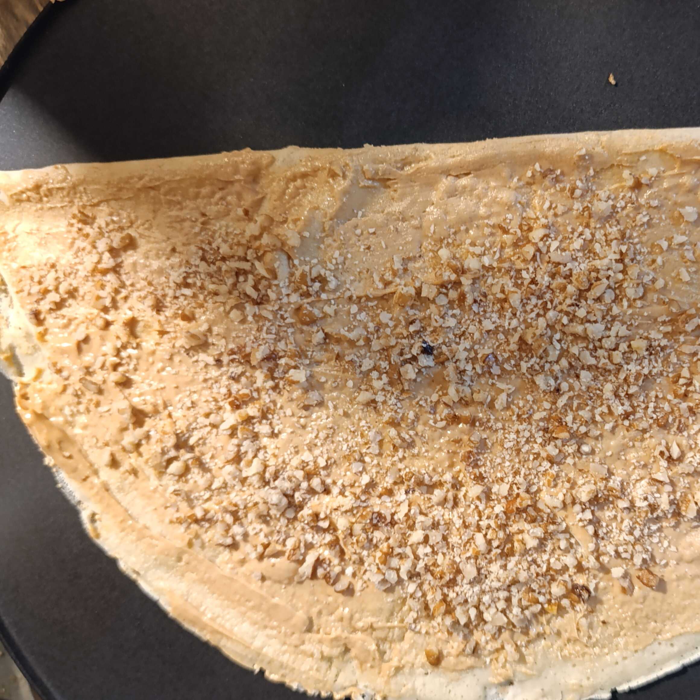 1 pieza de 8x8 untado Mitad de Nutella + Mitad de Queso Philadelphia + Plátano 🍌 + Nuez