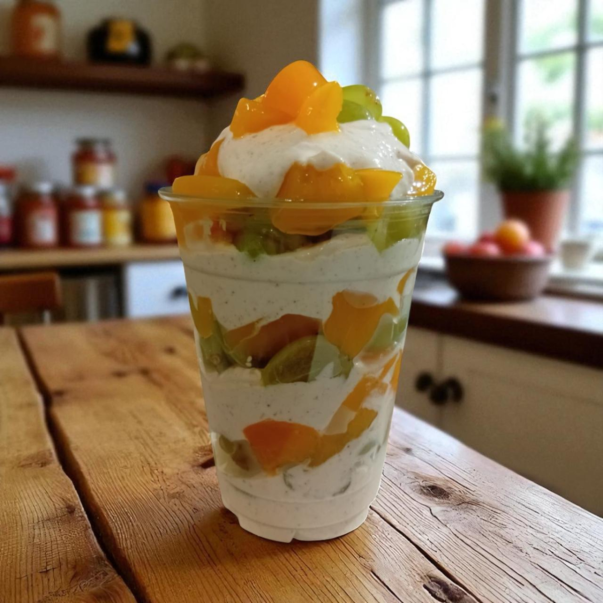Deliciosa crema especial de la casa con uvas y duraznos con crema