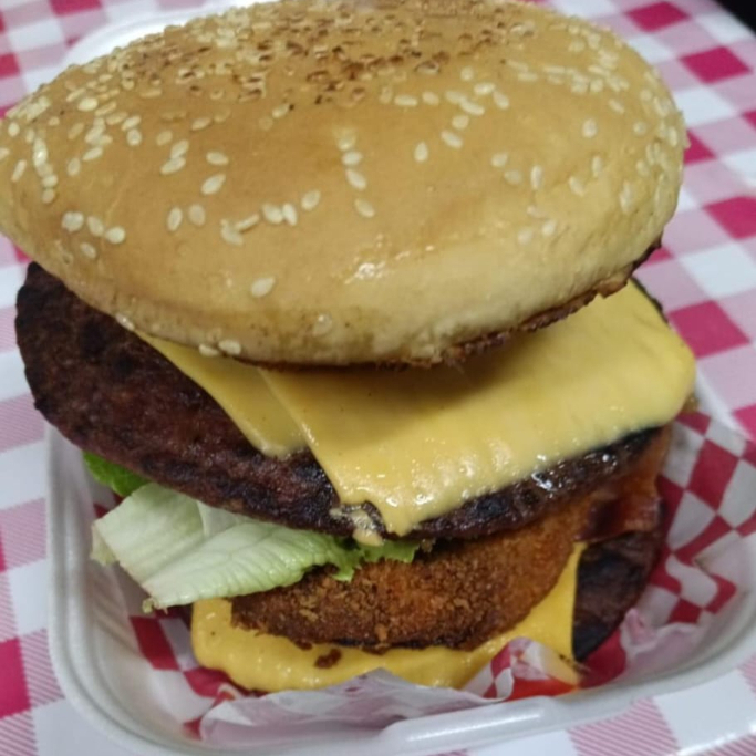 DOBLE CARNE DE RES , TOMATE , CEBOLLA ,LECHUGA , QUESO , ARO DE CEBOLLA Y ADERESOS A ELEGIR