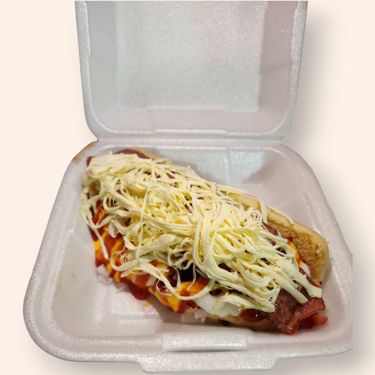 (Pan, salchicha, tomate, cebolla, chorizo, catsup, mayonesa, queso amarillo, tocino, queso de hebra)