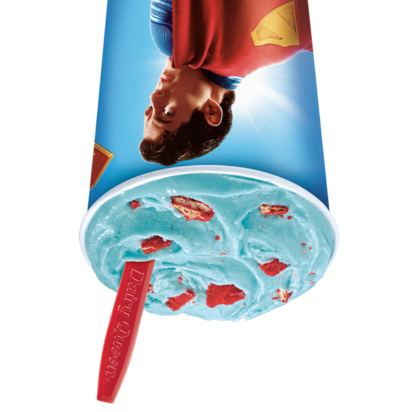 Base helado suave DQ centro ingrediente misterioso, sabor cereal de frutas, y crujientes waffles rojos relleno de Superman Blizzard®