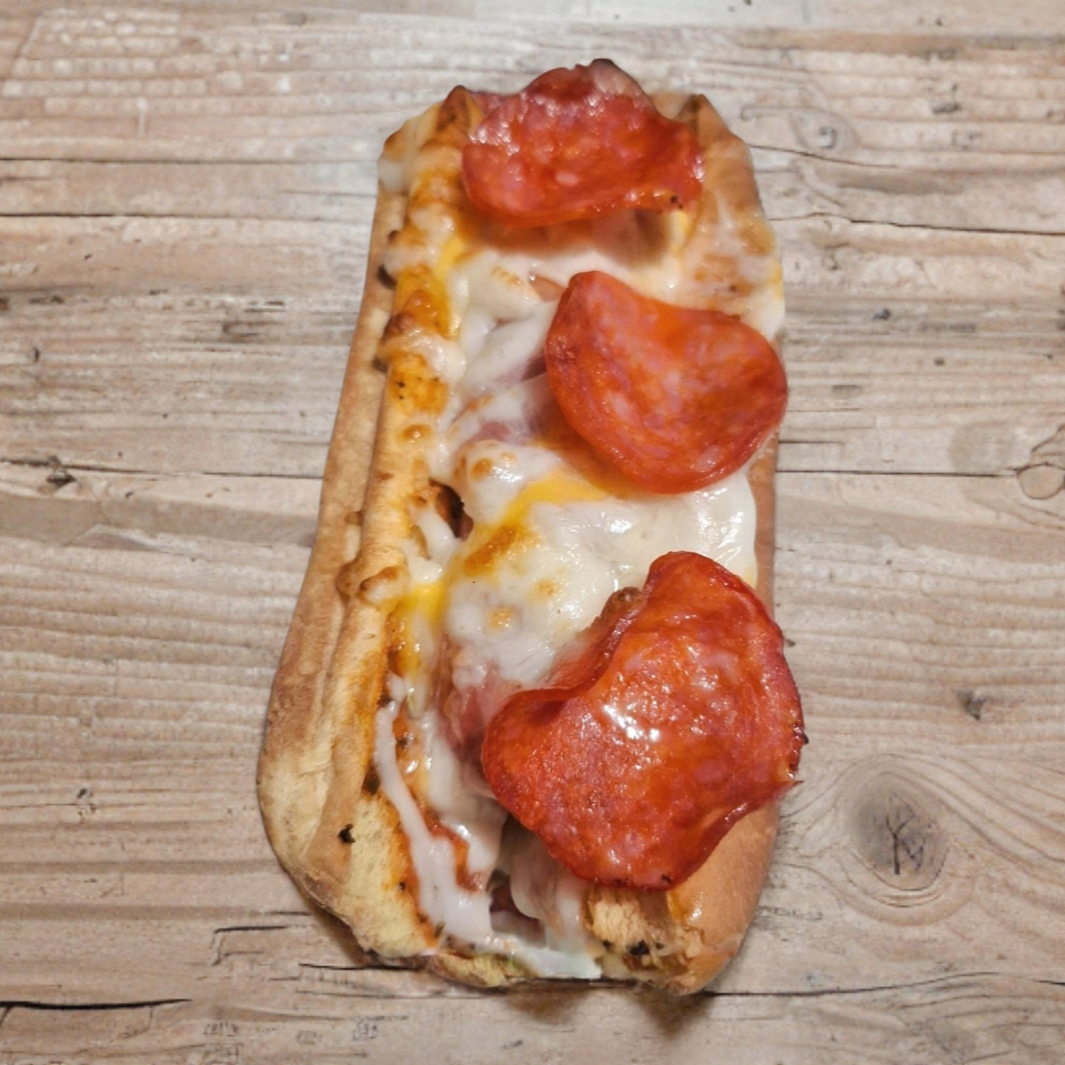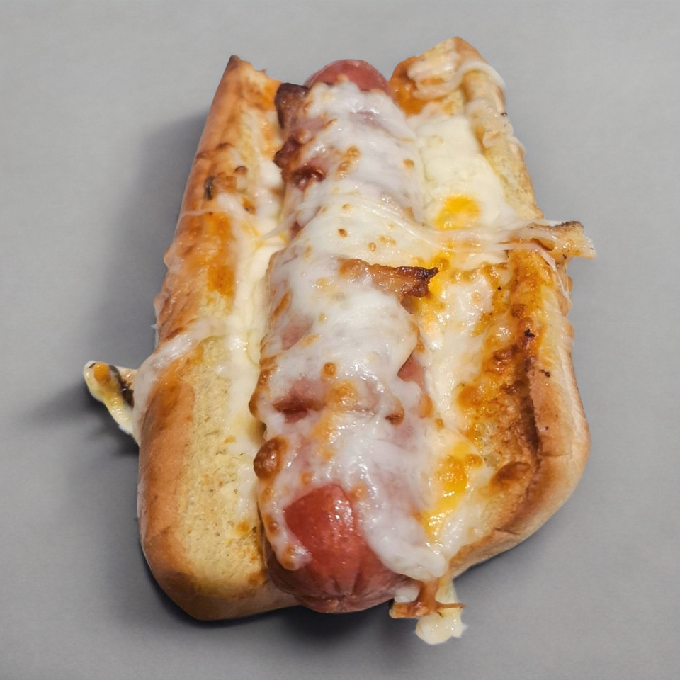 salchicha jumbo envueta en tocino, salsa de pizza, pepperoni y mezcla de 3 quesos (mozarela, gouda y cheddar)