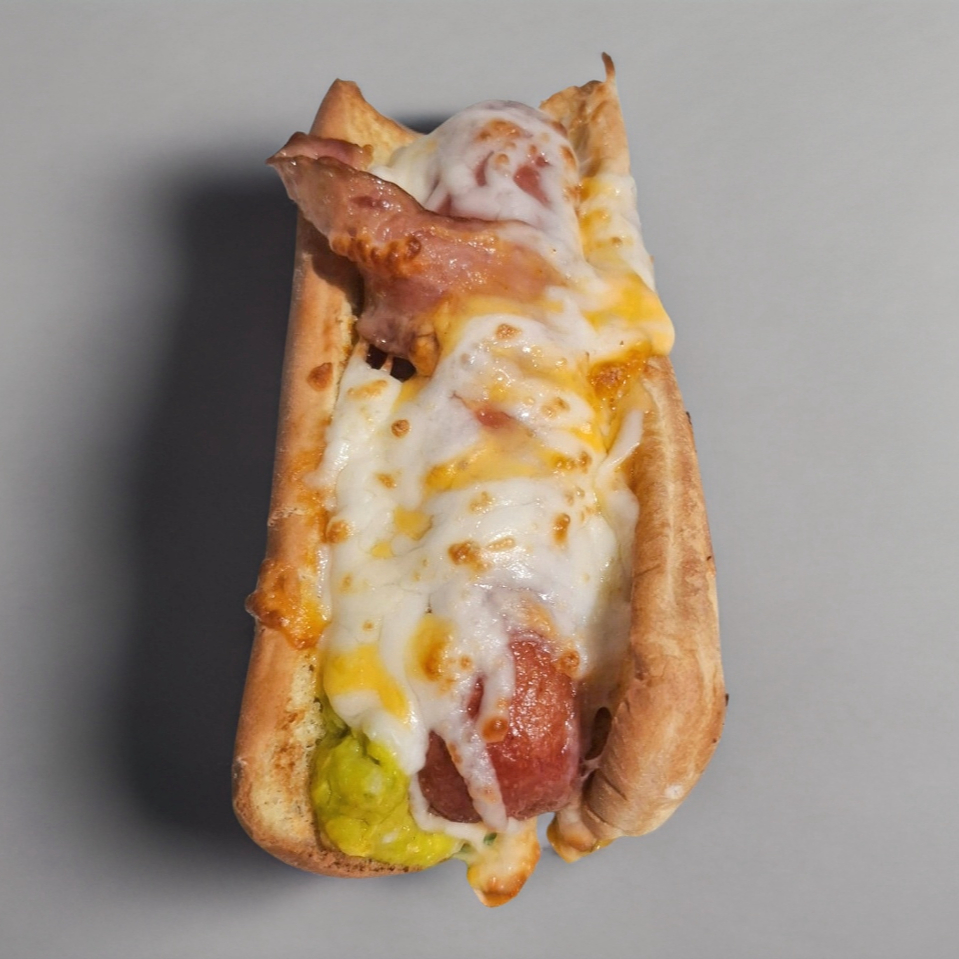 salchicha jumbo envuelta en tocino, aderezo, guacamole y mezcla de 3 quesos (mozzarella, gouda y cheddar)