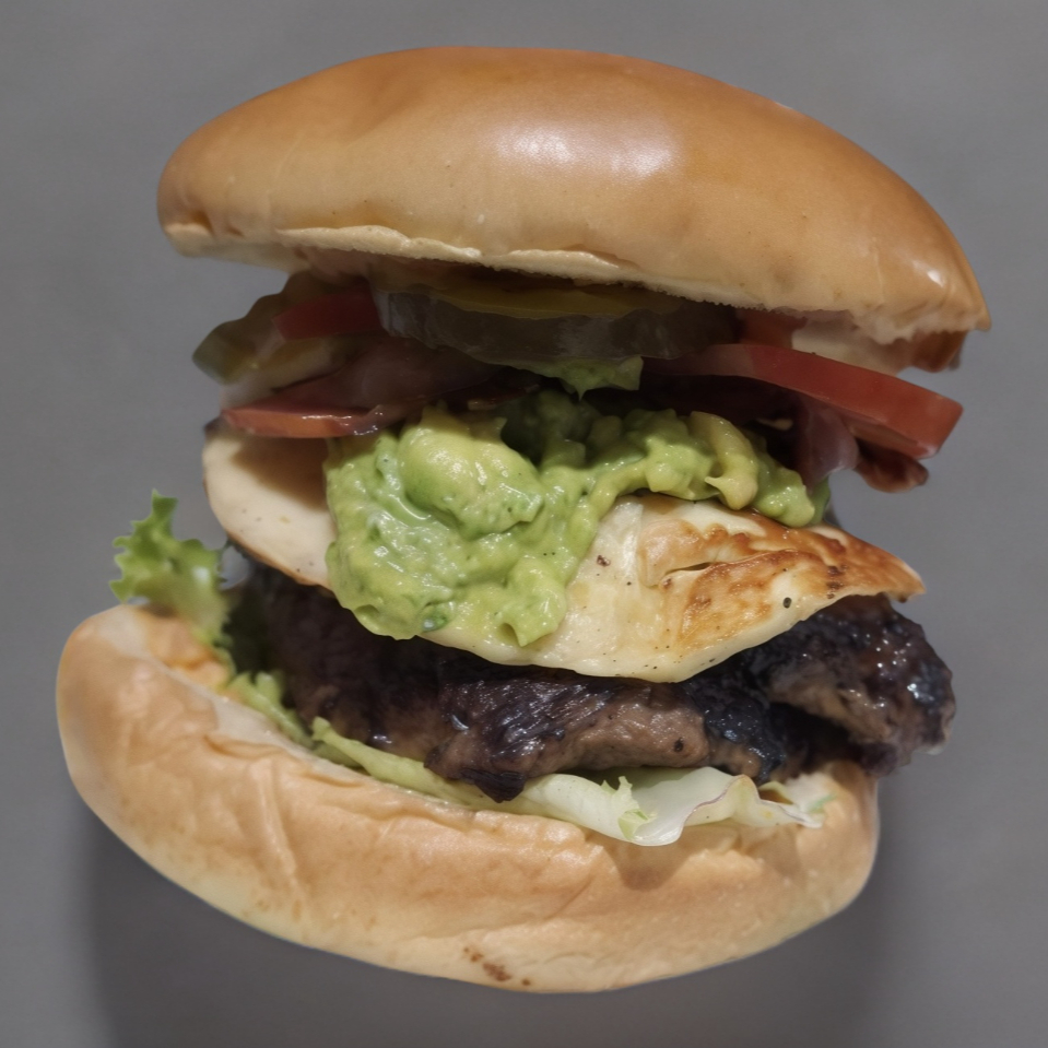 pan brioche, aderezo, lechuga italiana, carne de res, queso americano, guacamole, tocino, tomate, cebolla y pepinillos