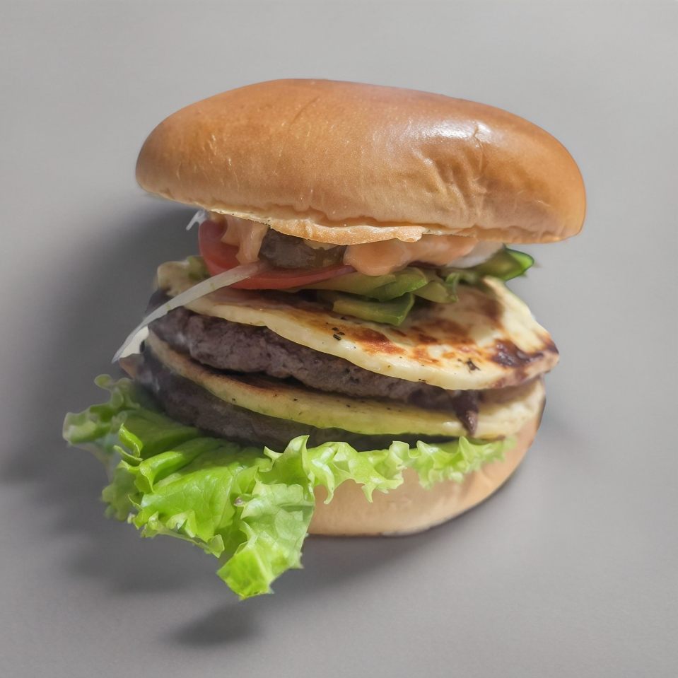 pan brioche, aderezo , lechuga italiana, doble carne de res, doble queso asadero, guacamole, tocino, tomate, cebolla, pepinillos