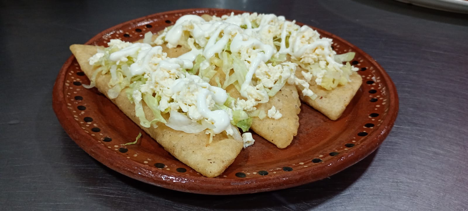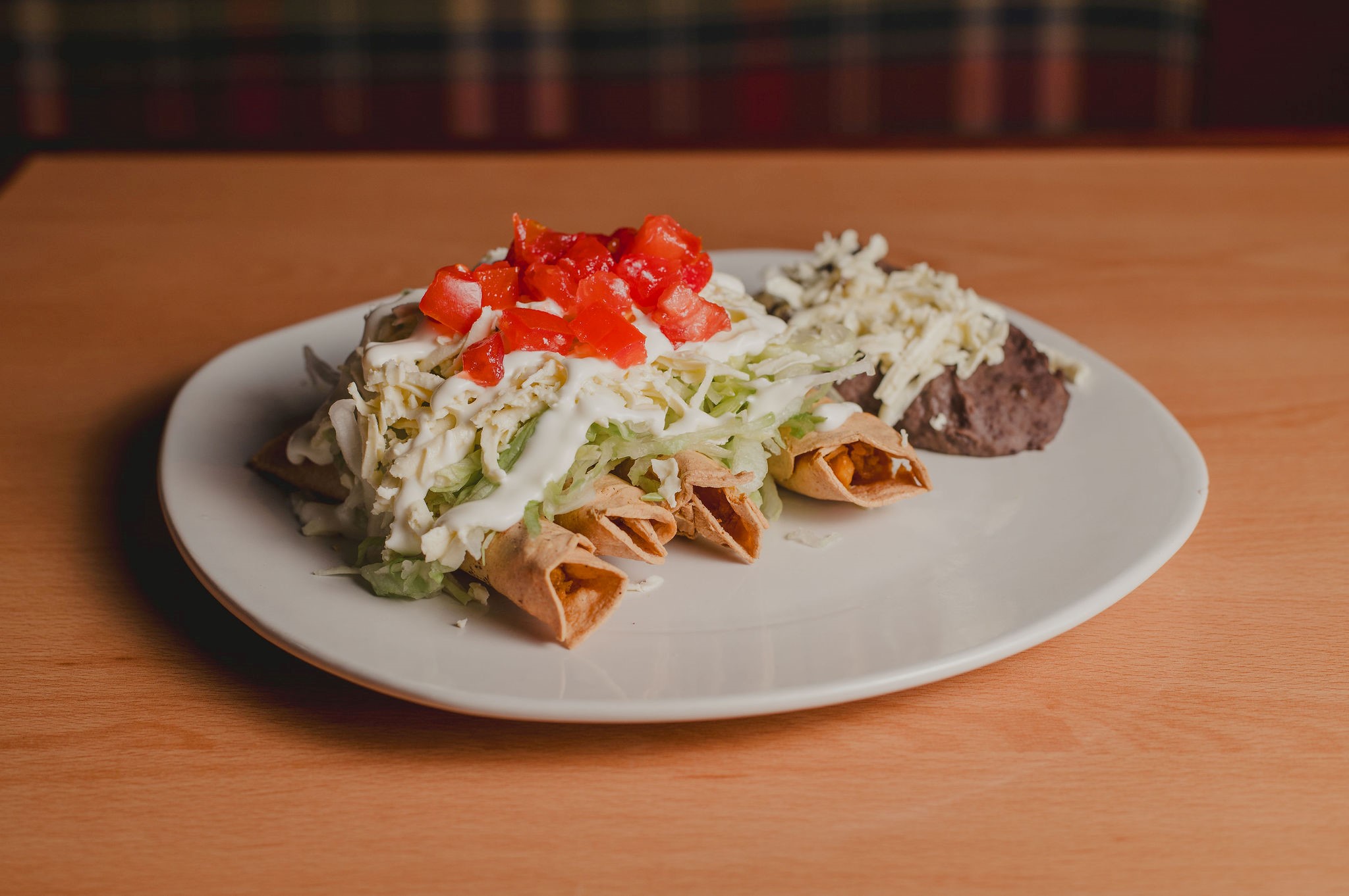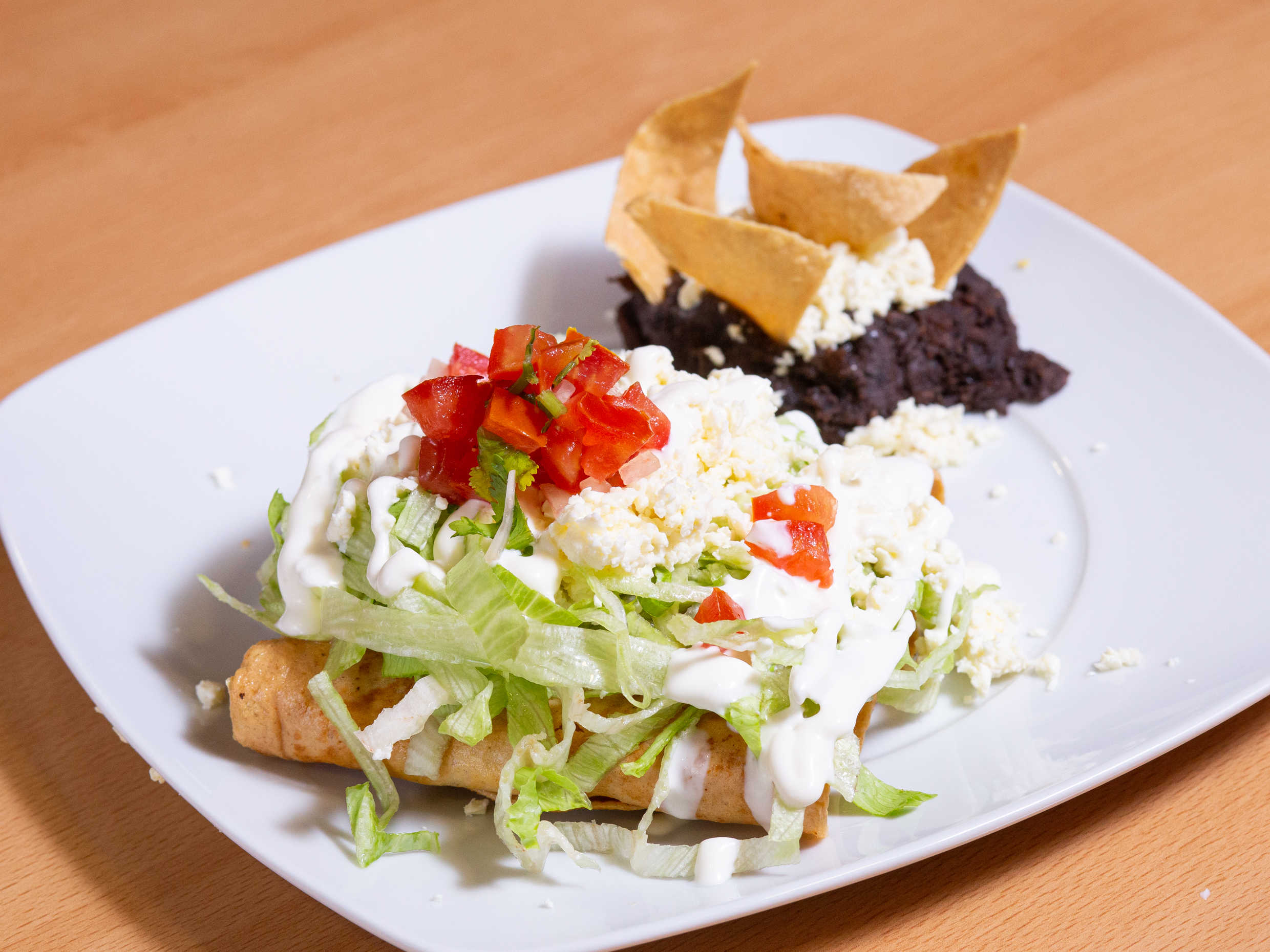 4 Piezas rellenas de pollo, preparados con lechuga, crema, queso fresco y pico de gallo, acompañados con frijoles refritos.