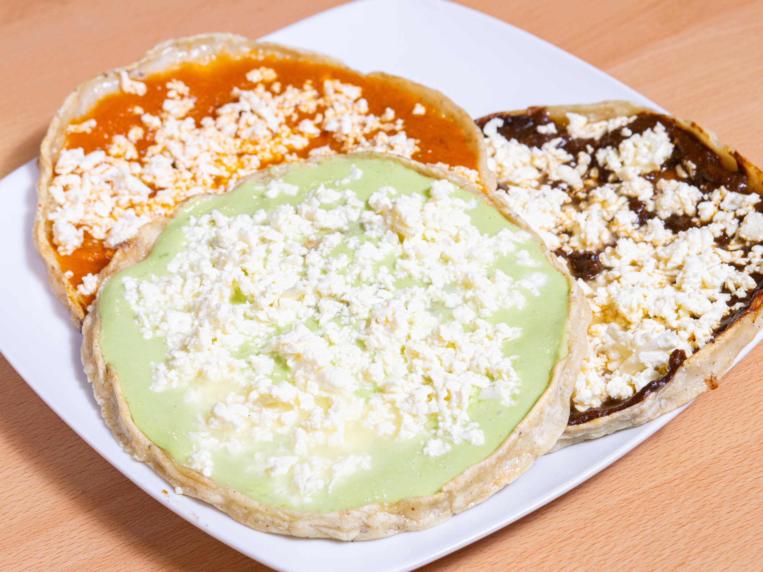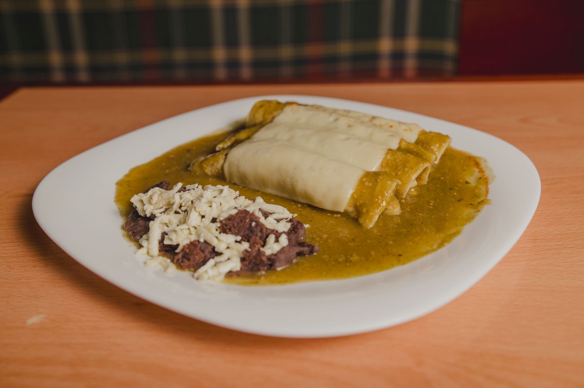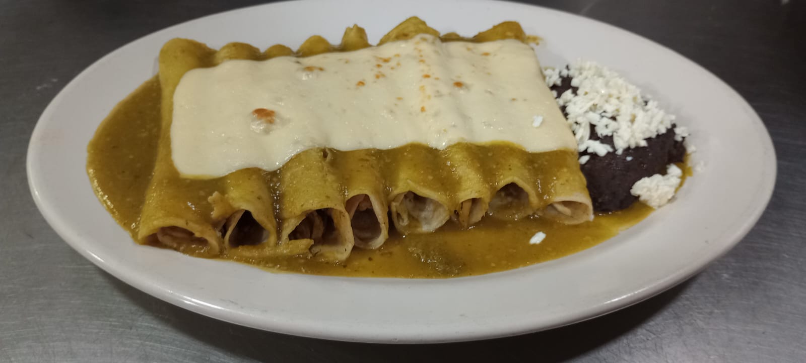 Orden de 4 enchiladas rellenas de pollo gratinadas (tomate, ranchera, verde y mole) con guarnición de frijoles refritos; un café americano